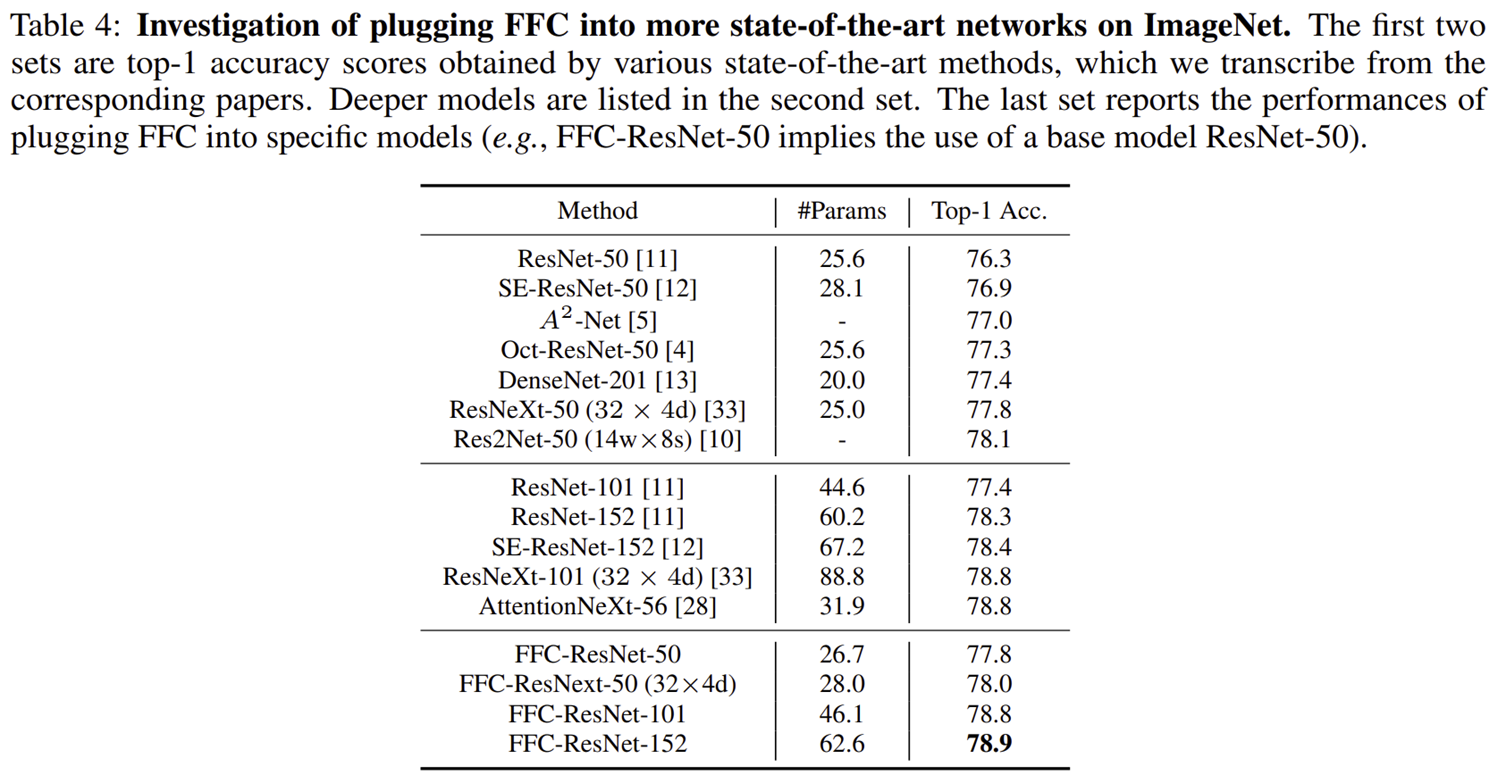 위 수식은 Convolution Theorem입니다. 간단하게 설명하면 spatial domain인 합성곱 ($f(x, y) * g(x, y)$)은 spectral domain의 곱 ($F(u, v) \cdot G(u, v)$)와 동일하다는 정리입니다. 이 과정에서 spectral domain에 어떤 값을 딱 하나만 변화를 준다고 가정하면 이는 spatial domain의 모든 값에 영향을 주기 때문에 non-local receptive field를 활용할 수 있을 것으로 볼 수 있습니다. 본 논문에서는 Fourier Transform의 이러한 특징을 이용해서 모델을 설계하여 Fast Fourier Convolution (FFC)라는 새로운 합성곱 연산 기법을 제안하였습니다.