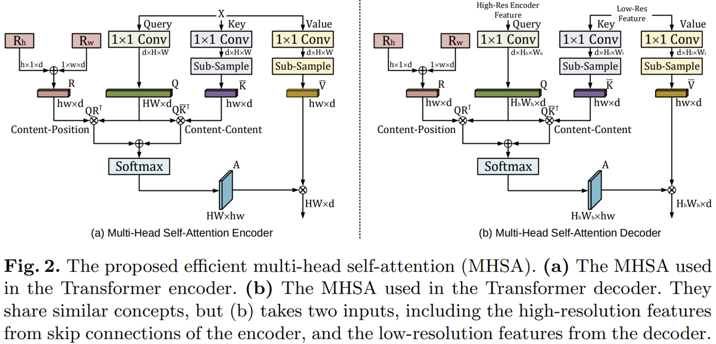 여기서 $\overline{\mathbf{K}}, \overline{\mathbf{V}} \in \mathbb{R}^{k \times d}$로 $k = hw < n$입니다. $h$와 $w$는 기존의 입력 특징 맵에 sub-sampling을 적용했을 때 나오는 더 작은 크기의 해상도로 정의되기 때문에 더 효율적으로 동작하게 됩니다. 따라서, 기존의 self-attention의 복잡도가 $\mathcal{O} (n^{2}d)$ 였다면 efficient self-attention의 복잡도는 $\mathcal{O} (nkd)$가 되어 효율적으로 변하게 됩니다.