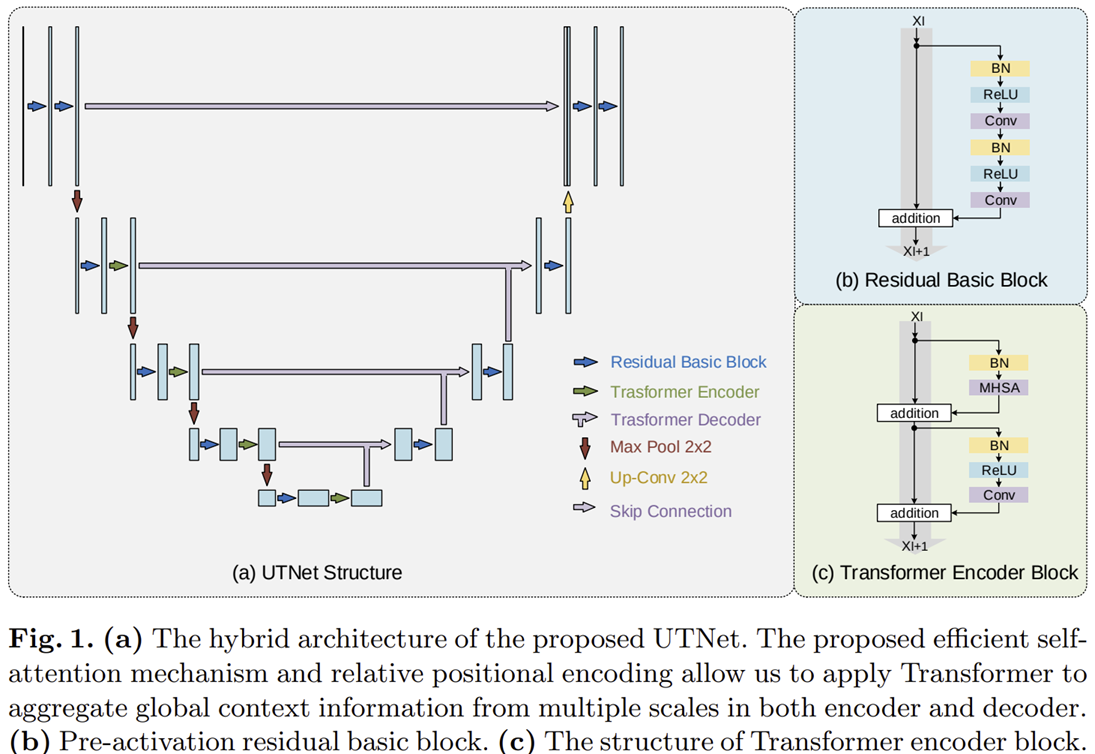 그림 1은 UTNet의 전체적인 구조를 보여주고 있습니다. 언뜻보면 기존의 UNet과 별차이가 없는 것을 볼 수 있습니다. 실제로도 그 차이는 기존의 UNet은 각 계층별로 합성곱 연산을 두번씩 수행하는 반면 UTNet은 합성곱 + Self-attention을 한번씩 번갈아가면서 진행하게 됩니다.