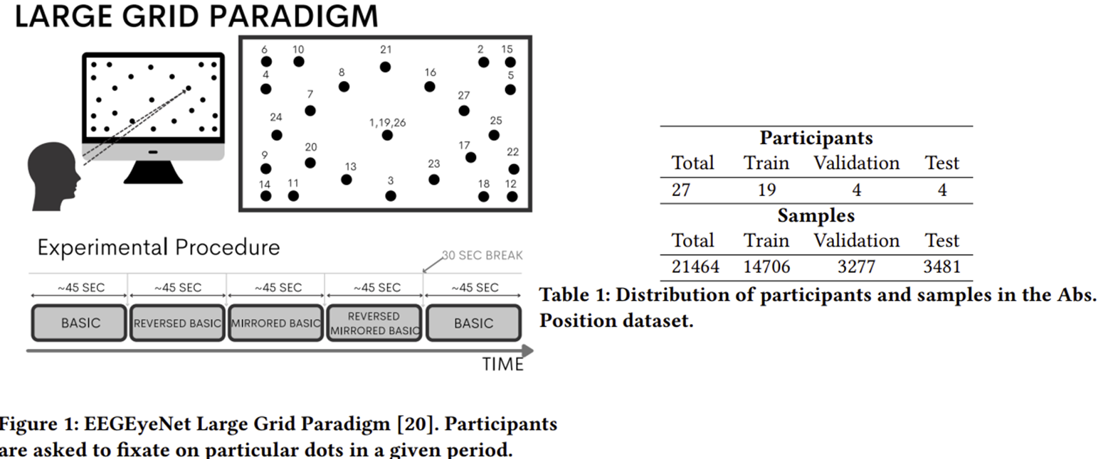 본 논문에서는 EEG 데이터를 이용해서 시선 추적 (Eye Tracking)을 위한 네트워크를 제안하고자 하였습니다. 이는 결국 현재 EEG 신호가 화면 상에서 어떤 $x$ 축과 $y$ 축 좌표에 대응하는 지에 대한 회귀 문제를 푸는 것과 동일합니다. 이러한 데이터셋은 이미 EEGEyeNet이라는 논문에서 제시되었으며 그림 1은 이를 얻은 방법에 대해서 설명하고 표 1은 데이터셋의 전체 개수를 보여주고 있습니다.