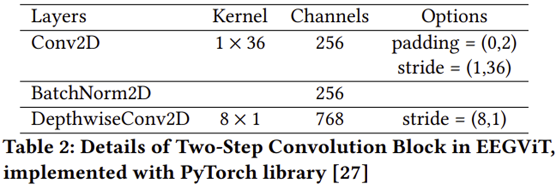이전에도 설명드렸다 싶이 본 논문에서 사용하는 CNN 파트는 두 단계로 구성된 합성곱 계층을 활용합니다. 이는 이전에 제가 설명드렸던 EEG Conformer와 거의 동일합니다. 표 2는 이를 설계하기 위한 상세한 하이퍼파라미터를 보여주고 있습니다. 이 과정을 간단하게 요약하면 다음과 같습니다.