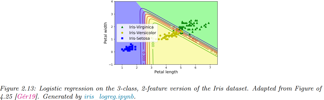 이를 더 직관적으로 보기 위해 3가지 클래스(품종)를 가진 아이리스(iris) 데이터셋을 예로 들어보겠습니다. 이 데이터셋에서 두 개의 특징(feature)만 사용하여 다중 클래스 로지스틱 회귀 모델을 학습시키면, 각 클래스 사이의 경계가 직선으로 나타나게 됩니다.