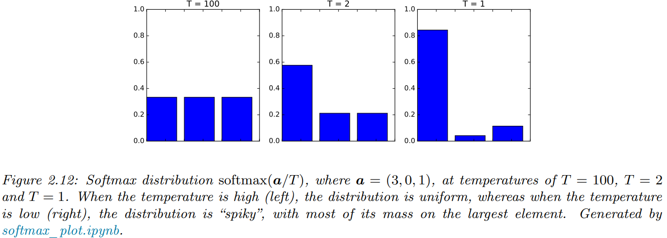 소프트맥스라는 이름이 붙은 이유는 이 함수가 일종의 부드러운(soft) 아그맥스(argmax) 함수처럼 작동하기 때문입니다. 아그맥스(argmax)는 여러 값 중 가장 큰 값을 선택하는 함수인데, 소프트맥스 함수는 이를 부드럽게 연속적인 확률 값으로 표현해줍니다. 이 특성을 더 이해하기 위해, 각 로짓값 $a_{c}$를 어떤 상수 $$ (온도, temperature)로 나누어준 뒤, $T$ 값을 조절하면 어떻게 되는지 살펴볼 수 있습니다.