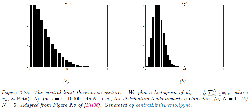 간단한 예시를 들어 설명해보도록 하겠습니다. 베타 분포는 정규분포와 매우 다른 모양을 가지는 분포입니다. 하지만 중심극한정리의 예시로 베타분포에서 추출한 확률변수들의 평균을 구해보면 흥미로운 결과를 얻을 수 있습니다. 처음에는 베타 분포에서 추출한 확률변수 하나의 분포는 정규분포와 다를 수 있습니다. 그러나 이 확률변수의 평균을 표본의 크기 $N$ 이 점점 더 클수록(10, 50, 100 등), 그 평균의 분포는 매우 빠르게 정규분포 형태로 수렴하게 됩니다 (그림 2.23). 즉, 본래 분포의 모양과는 관계없이 확률변수들의 평균이나 합은 정규분포 형태를 띄게 되는 것입니다.