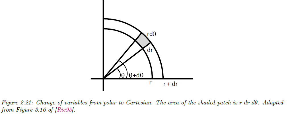 이 식을 좀 더 직관적으로 기하학적으로 보면, 극좌표계에서는 미소한 면적요소 $dA$가 $rdrd\theta$의 형태로 표현됩니다 (그림 2.21 참고). 따라서, 극좌표에서의 미소영역에서의 확률은 다음과 같습니다.