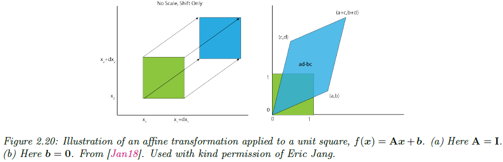 이를 2차원에서 선형 변환을 예로 들어 살펴보겠습니다. $\mathbf{A} = \begin{pmatrix} a & c \\ b & d \end{pmatrix}$라고 할 때 $f(x) = \mathbf{A}x + \mathbf{b}$라고 가정하겠습니다. 이 변환에서 단위 정사각형(unit square)의 면적이 어떻게 바뀌는지 살펴봅시다. 이 변환을 적용하면, 단위 정사각형은 일반적으로 평행사변형(parallelogram)이 됩니다 (그림 2.20 참고). 이때 평행사변형의 면적은 정확히 행렬 $A$의 행렬식 $\text{det}(A) = ad - bc$배만큼 확대되거나 축소됩니다. 즉, 원래의 면적에 이 행렬식을 곱한 값이 새로운 면적이 되는 것입니다.