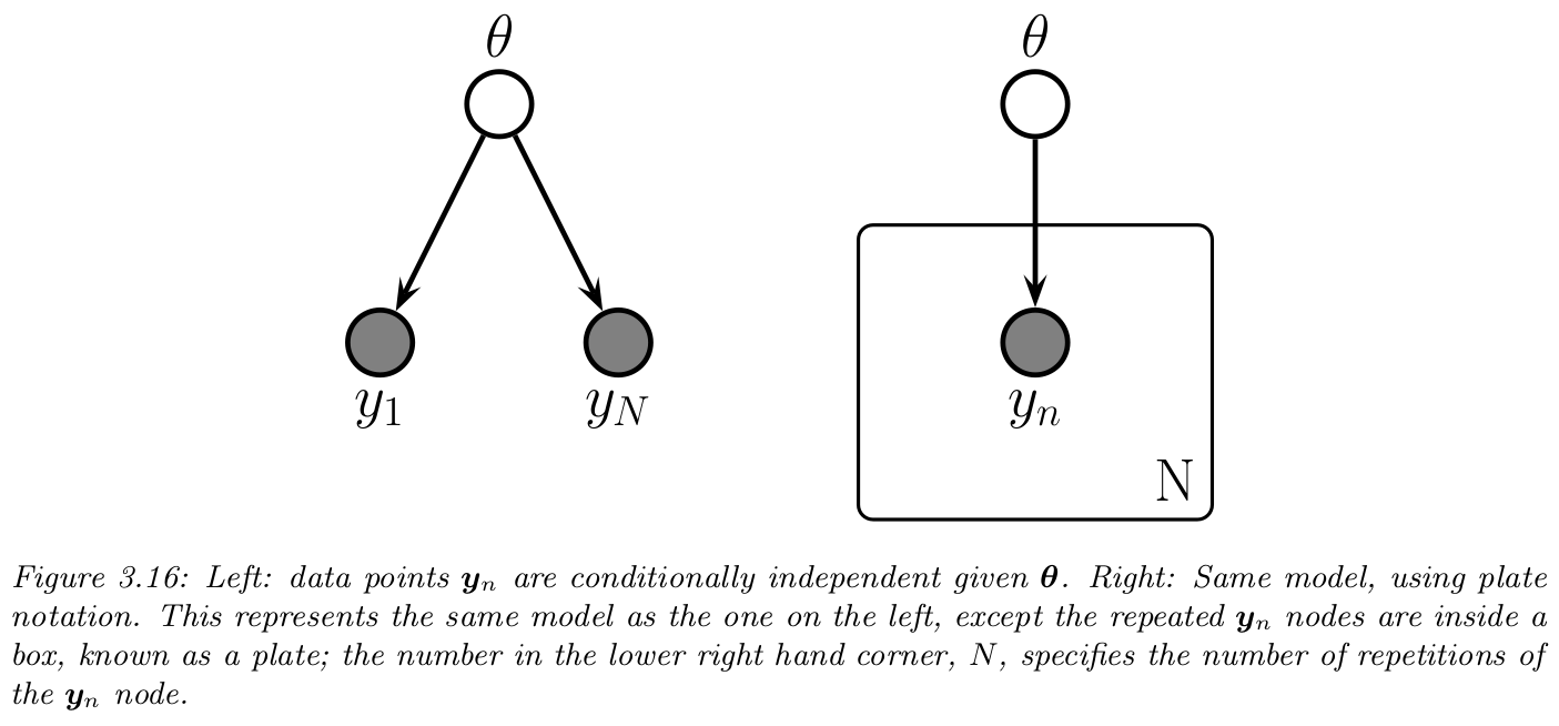 그림 3.16(a)에서 보면 $\mathbf{y}$가 $N$번 반복되어 그림이 복잡합니다. 이러한 시각적 혼란을 줄이기 위해 그림 3.16(b) 플레이트 표기법(Plate notation)을 사용하기도 합니다. 그냥 반복되는 변수들을 작은 상자로 둘러싸고 상자 오른쪽 아래에 반복 횟수를 적습니다. 이는 모델을 “펼칠(unroll)” 때, 상자 안 노드들이 그 숫자만큼 자동으로 복제된다고 약속합니다. 이 표기법은 특정 종류의 베이지안 모델을 간결하게 표현할 때 널리 사용됩니다.