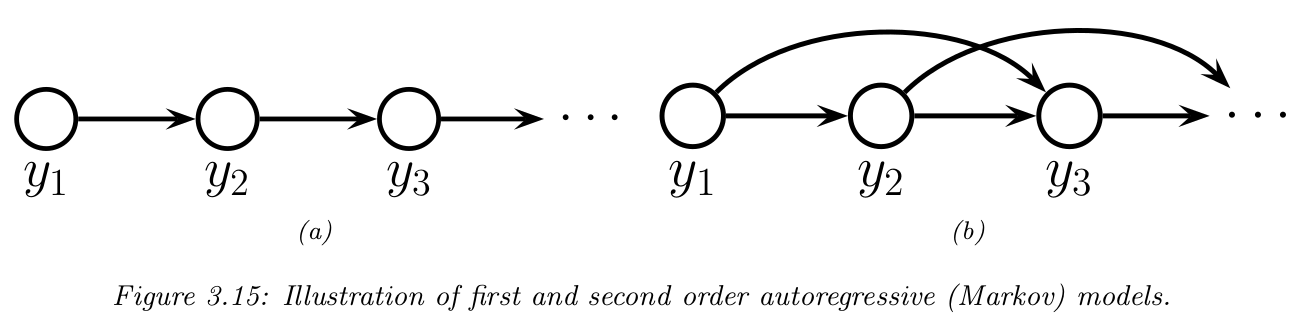 하지만, 조건부 분포 $p(y_{t} \mid \mathbf{y}_{1:t - 1})$를 모두 담으려면 파라미터 수가 지수적으로 증가합니다. 이러한 문제를 해결하기 위해 1차 마르코프 조건(first‑order Markov condition)을 가정합니다. 즉, "현재 상태 $y_{t}$만 알면 미래 $\mathbf{y}_{t+1:T}$는 과거 $\mathbf{y}_{1:t-1}$와 독립이다"라는 것이죠. 이를 만족하는 PGM은 그림 3.15(a)과 같이 그릴 수 있으며 수식적으로도 표현할 수 있습니다.