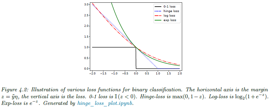 하지만 방금 보았던 0-1 손실의 경우 계단함수이기 때문에 그림 4.2에서 볼 수 있다싶이 매끄럽지 않습니다. 이로 인해 최적화가 매우 까다롭고 실제로는 NP-Hard 문제로 알려져 있습니다. 그래서 실무에서는 보통 다른 손실함수를 사용합니다. 핵심적인 아이디어는 1) 0-1 손실을 직접 최소화하기보다 2) 볼록 상계(Convex Upper Bound)를 가지는 손실함수를 만들고 3) 이 손실함수를 최소화하면 계산이 훨씬 간단해집니다.