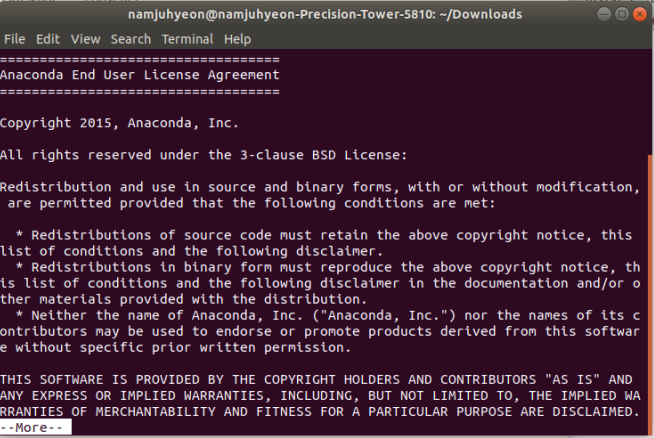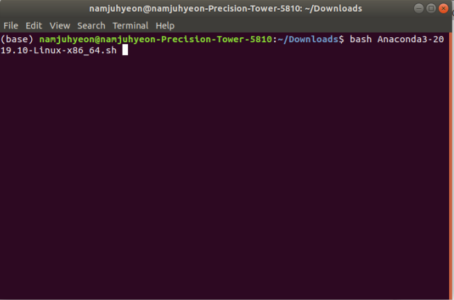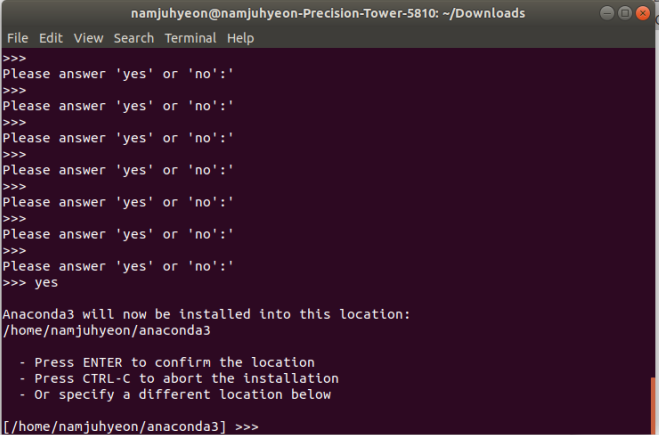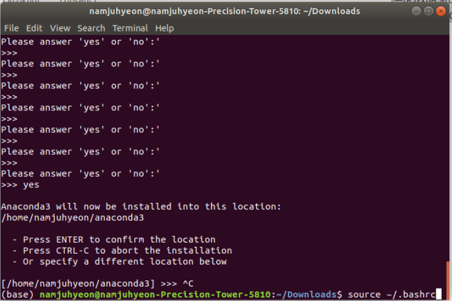 bash 설치한 아나콘다 파일.sh를 입력하면 Enter를 쭉 누르다가 yes를 누르는 시점에서 yes를 선택합니다. 이렇게 되면 자동으로 아나콘다3를 설치할 경로를 정해주게 됩니다.(/home/[user name]/anaconda3)