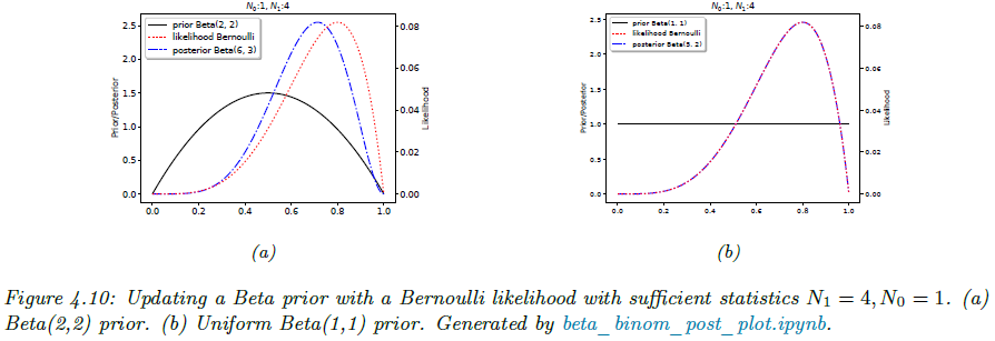 실제로 간단한 예시를 들어보겠습니다. 그림 4.10 (a)와 같이 사전확률을 $\text{Beta}(2, 2)$, 즉 $ \tilde{\alpha} = \tilde{\beta} = 2 $라고 설정했다고 가정하겠습니다. 이 뜻은 “이미 앞면을 2번, 뒷면을 2번 본 것 같다”는 약한 신념을 의미합니다. 즉, $\theta \approx 0.5$일거라고는 기대는 하고 있지만 강한 믿음은 가지지 않습니다. 위 그림에서 빨간선이 사전확률분포 $p(\theta)$, 검은선이 우도함수 $p(\mathcal{D} \mid \theta)$, 그리고 파란선이 사후확률분포 $p(\theta \mid \mathcal{D})$를 의미합니다. 결국 파란선인 사후확률분포는 파란선은 빨간·검은 선 사이에서 타협(compromise) 한 형태가 됩니다. 이때, 데이터가 충분히 많아지면 검은선 쪽(우도)으로 더 기울고, 데이터가 적으면 빨간선(사전) 영향이 더 커지게 되죠.