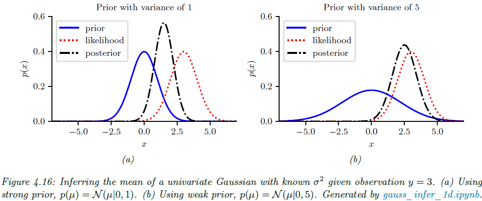 즉, $w$는 “사전 정보의 힘(정밀도)”이 사후에 차지하는 비율이고 $1 - w$는 데이터 한 점이 차지하는 비율을 의미합니다. 따라서, 사전이 약하다는 것은 $\tilde{\lambda} < \kappa$이기 때문에 $w \approx 0$이 되어 $\hat{m} \approx y$가 되는 것이죠. 반대로 사전이 크다는 것은 $\tilde{\lambda} > \kappa$이기 때문에 $w \approx 1$이 되어 $\hat{m} \approx \tilde{m}$가 되는 것이죠.