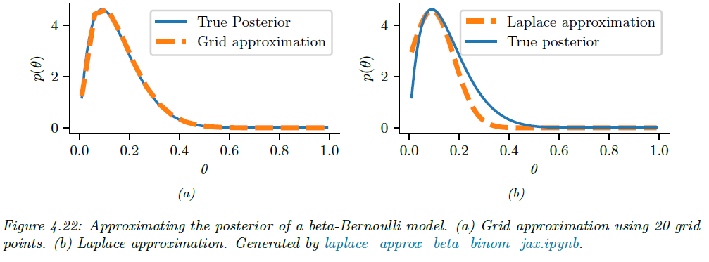 그림 4.22 (a)는 1차원 베타-베르누이 예제에 이 방법을 적용한 결과입니다. 이 방법은 격자 점마다 우도를 계산하여 심한 비대칭(skewed) 한 사후 분포도 정확히 포착할 수 있습니다. 하지만 고차원으로 늘어날 수록 필요한 격자의 수가 지수적으로 폭증하게 됩니다. 예를 들어, 각 차원에 100개만 두어도 4차원이라면 $100^{4} = 10^{8}$개의 점이 필요합니다. 이는 계산·메모리 부담이 급격히 커지므로, 실제 고차원 문제엔 부적합합니다. 따라서 그리드 근사는 저차원 + 거칠게 분포 형태를 보고 싶을 때 유용하며, 고차원 모델에는 다른 근사 기법(변분 추론, MCMC 등)을 사용해야 합니다.