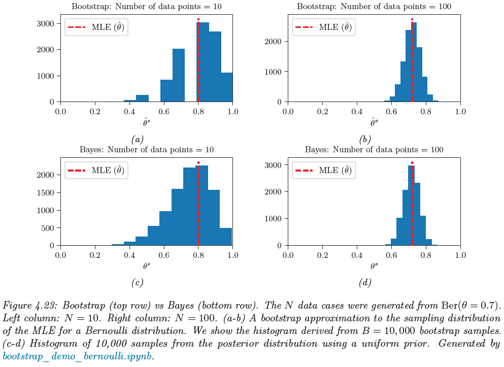 그림 4.23 (a)와 (b)는 베르누이 MLE의 샘플링 분포를 부트스트랩으로 근사한 모습을 보여주고 있습니다. $N = 10$일 때는 분포가 비대칭적이라서 가우시안 분포와는 거리가 있지만 $N = 100$이면 지난 포스팅의 결과대로 가우시안 모양에 근사하게 됩니다.