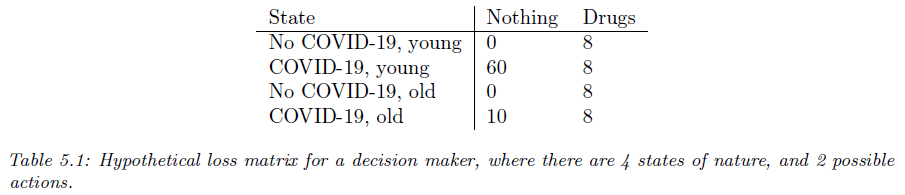 - 실제 자연 상태 $h \in \mathcal{H}$에서 행동 $a$를 했을 때 발생되는 비용 또는 손실 $l(h, a)$가 있습니다. COVID19에서는 자연 상태는 환자 연령(젊음 및 고령) 그리고 질병 여부(감염 및 비감염)이 있을 수 있으며 환자 연령은 관측가능하지만 질병 여부는 검사 결과로 추론해야합니다.