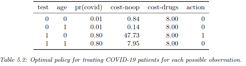 표 5.2는 각 상태에 따른 최적화된 행동을 표로 나타낸 결과입니다. 즉, 젊고 양성이라면 약을 투여하는 것이 좋고 그렇지 않다면 약을 투여하지 않는 것이 이득이라는 것이죠. 다만, 약값을 5 QALY로 낮춘다면 양성인 모든 환자에게 투여가 최적의 행동임을 알 수 있습니다. 이처럼 확률적 불확실성과 행동의 비용·혜택을 정량화해 합리적인 결정을 내리는 것이 베이지안 결정이론의 핵심입니다.