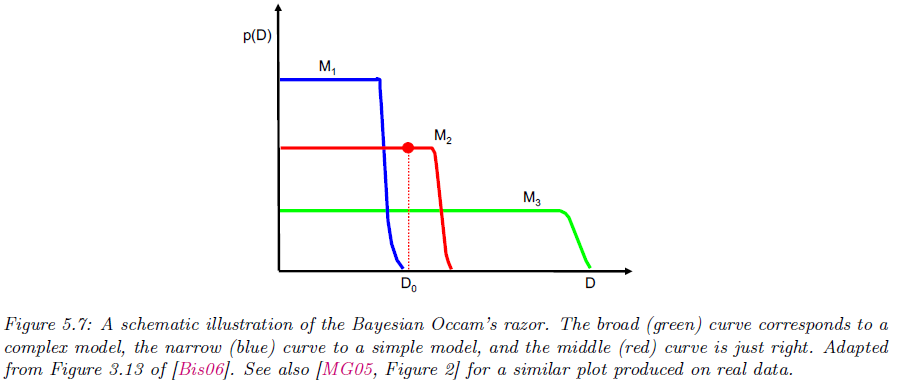 이 그림에서 파란색 선인 $M_{1}$은 단순한 모델로 폭이 매우 좁고 높이가 큽니다. 이는 소수의 아주 단순한 데이터셋에 확률에 집중한다는 것을 보여주죠. 관측 데이터 $\mathcal{D}_{0}$가 파란 곡선의 급격한 하강 이후에 위치하므로 $p(\mathcal{D}_{0} \mid M_{1})$에 대해서는 과소적합이 발생했다고 볼 수 있습니다.