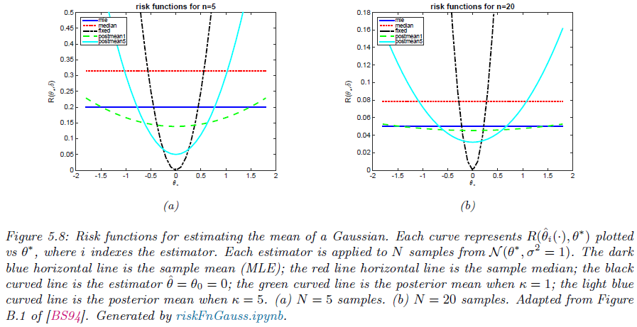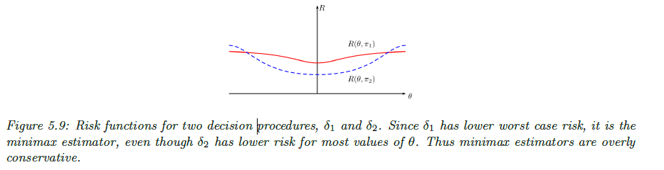 그림 5.9에서는 $\delta_{1}$는 $\theta$ 전 범위에서 $\theta_{2}$ 보다 최악의 리스크가 낮으므로 최소-최대 추정량이 됩니다. 이는 최악의 상황에서도 안정적인 성능을 보장합니다. 하지만, 계산이 복잡하고 매우 보수적(pessimistic)인 결과를 제공하죠. 이는 자연현상이 항상 적대적이라고 가정하는 셈이 됩니다. 이러한 최소-최대 추정량은 최악의 사전분포 하에서의 베이즈 추정량과 동일해집니다. 게임 이론 상황이 아니라면 이러한 적대적인 가정은 매우 비 현실적이죠.