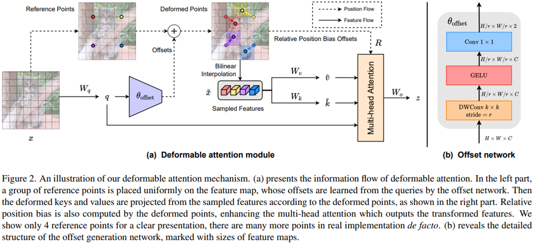 따라서, 핵심적인 아이디어로 "Shared Shifted Key/Value"입니다. 이는 모든 쿼리가 동일한 변형된 포인트 집합을 사용하는 것입니다. 이를 통해 효율성과 표현력을 더욱 향상시킬 수 있죠. 그리고 DCN에서 활용한 offset network를 여기에서 적용하게 됩니다. 이는 쿼리 토큰이 입력으로 제공되어 출력으로 참조점에 대한 2D 오프셋를 줍니다. 구조는 $5 \times 5$ DW Convolution + GELU + $1 \times 1$ Convolution으로 구성되어 있습니다. 그러면 얻은 2D 오프셋을 기반으로 Bilinear Interpolation을 적용하여 변형된 위치에서 특징 샘플링 후, 키와 밸류를 생성하게 됩니다.