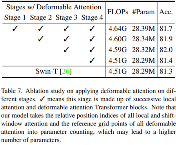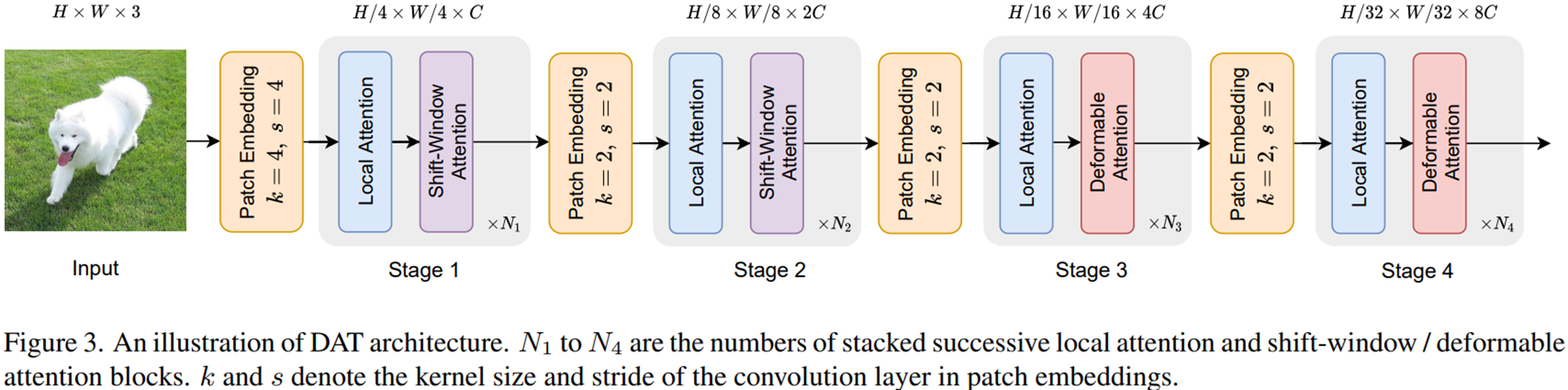 - 스테이지 구성: 총 4개의 스테이지로 구성되어 있으며 1번과 2번 스테이지는 Swin Transformer의 Shifted Window Attention을 적용하여 3번과 4번 스테이지에서는 본 논문에서 제안하는 Deformable Attention Module을 적용합니다. 이 설계 덕분에, 초반에는 가볍게 로컬 특징을 잡고 후반에는 전역 컨텍스트까지 고려한 강력한 표현을 학습합니다.