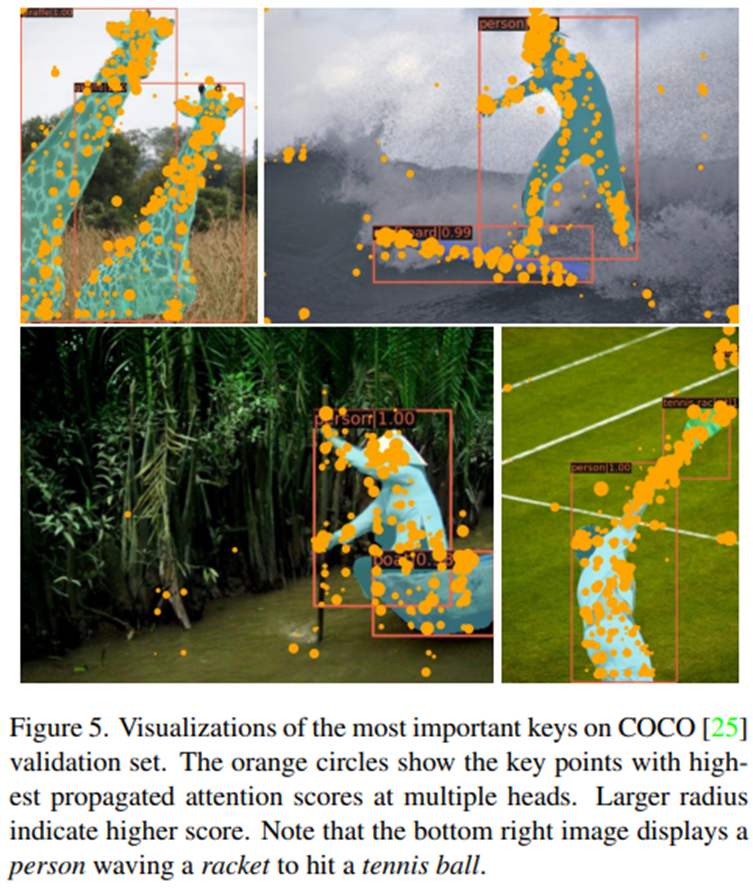 그러면 Background에서 설명했던 DCN 컨셉을 바로 Transformer에 도입하면 되지 않을까요? 하지만, 이는 Transformer에서 쿼리의 개수와 키의 개수에 비례하여 이차 복잡도가 발생하여 메모리 및 연산량이 더욱 증가하게 됩니다. 또한, 이전 연구들에 따르면 시각 모델에서 서로 다른 쿼리들에 대응되는 attention map이 유사한 것을 관찰하여 공유된 변형 키/밸류로 효율성을 확보할 수 있음을 언급하였습니다.