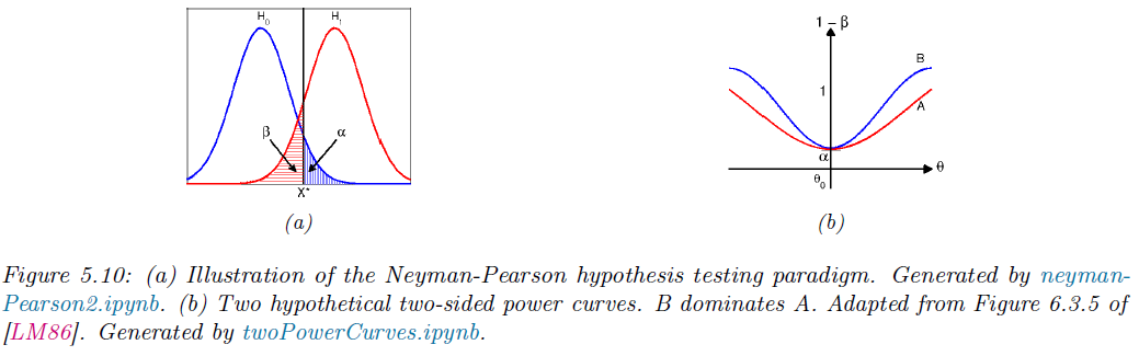 이는 그림 5.10 (a)에서 수평으로 음영처리된 빨간색 영역에 해당합니다. 저희는 여기서 검정력을 $1 - \beta(\mu_{1})$으로 정의합니다. 이는 $H_{1}$이 참일 때 $H_{0}$를 기각할 확률, 즉 $p(\hat{H} = 1 \mid H = 1)$입니다. 이는 참양성률에 해당하며 귀무가설이 틀렸음을 올바르게 인식하는 능력을 반영합니다. 이때, 그림 5.10 (b)와 같이 두 검정 $A$와 $B$가 있을 때 동일한 제1종 오류율에서 $\text{power}(A) \ge \text{power}(B)$이면 $B$가 $A$를 지배한다라고 말합니다.
