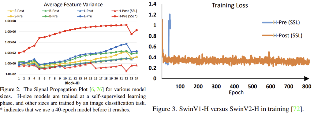 Swin Transformer V1을 포함한 대부분의 Vision Transformer 계열은 기존의 Vanilla ViT에서 이어받은 구조를 그대로 사용했습니다. 즉, 각 블록의 시작 부분에 Layer Norm을 적용하는 Pre-Norm 방식을 채택하였죠. 하지만, 이는 모델의 규모를 늘리게 되면 문제가 발생합니다. Residual block이 출력이 곧바로 메인 브랜치에 더해지면서 층이 깊어질수록 activation 값이 점점 커지게 됩니다 (그림 2 참고). 그 결과 얕은 층과 깊은 층 사이의 진폭의 차이가 지나치게 커지게 되고 이는 훈련 불안정성으로 이어집니다. 결국, Pre-Norm 구조는 작은 모델에서는 괜찮지만, 대규모 모델로 확장할 때 학습이 무너지기 쉬운 구조라는 한계가 드러난 것입니다.