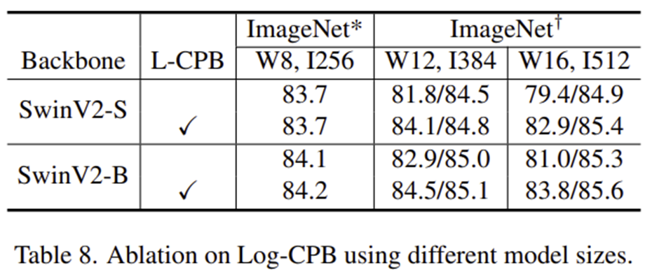 - 해상도 전이 개선 → Log-Spaced Continuous Position Bias(Log-CPB)로 저해상도 pre-training → 고해상도 fine-tuning 간 성능 저하 최소화