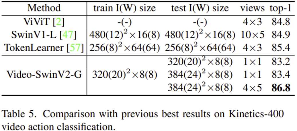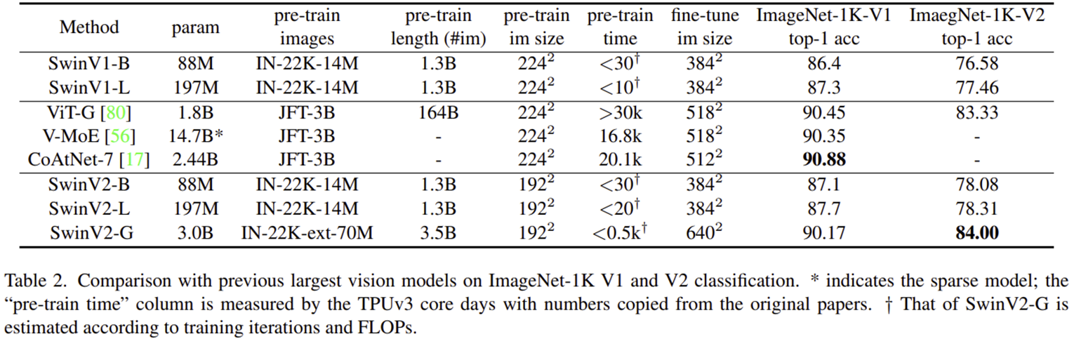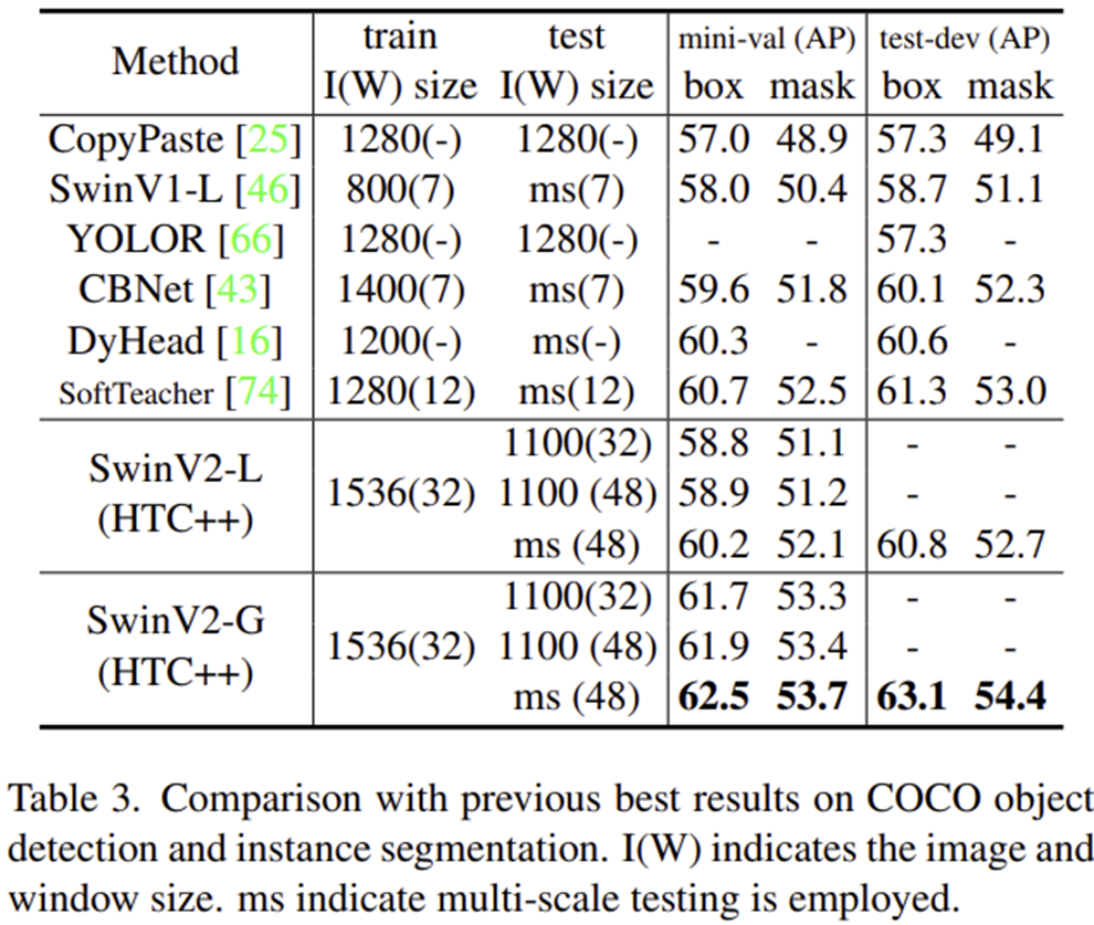 이 세 가지 기법 덕분에 Swin Transformer V2는 30억 파라미터 모델을 A100-40GB GPU에서 학습할 수 있었고, COCO 객체 탐지(1536×1536 해상도) 및 Kinetics-400 행동 인식(320×320×8 해상도) 등의 대규모 비전 벤치마크에서 성공적으로 실험할 수 있었습니다.