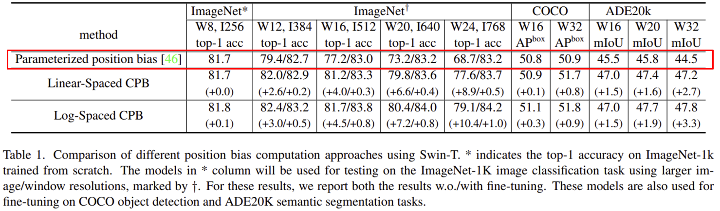 - 해상도 전이 문제 (Resolution Transfer Gap): 사전학습은 보통 저해상도에서 진행되고 다운 스트림 태스크는 고해상도 이미지를 필요로 합니다. Swin V1에서는 이를 단순히 bicubic interpolation으로 해결하였지만 고해상도로 전이할 때 성능이 급격히 떨어지는 문제가 발생하였습니다. 실제로 표 1의 Parameterized Position Bias 행을 보면 사전 학습은 $256 \times 256$ 해상도 (W8 윈도우)에서 진행했는데 더 큰 해상도 또는 윈도우(W12 ~ W24)로 전이하면 성능이 크게 감소하게 됩니다 (81.7 → 68.7).