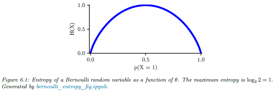이를 이항 엔트로피 함수(binary entropy function)이라고 하면 $\mathbb{H}(\theta)$라고 표기합니다. 그림 6.1이 이 예시이며 분포가 균등한 $\theta = 0.5$에서 엔트로피가 최대값인 1비트를 가집니다.