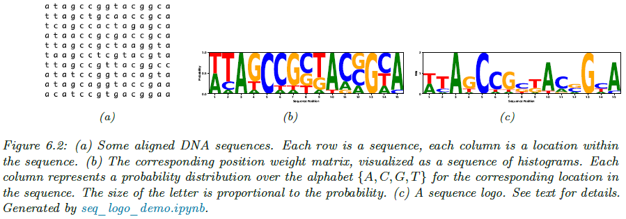 그림 6.2는 이를 시각화한 결과입니다. (a)는 DNA 염기 서열이고 (b)는 위치 $t$에서 문자 $k$의 크기를 경험적 빈도 $\theta_{tk}$에 비례하게 그린 것 입니다. 또 다른 시각화 방식으로 서열 로고(sequence logo)가 있으며 이는 그림 (c)에서 보이는 것과 같D이 그릴 수 있습니다. 각 열은 $R_{t} = 2 - H_{t}$로 스케일링됩니다. 여기서 $H_{t}$는 $\hat{\theta}_{t}$의 엔트로피이며 $2 = \log_{2}(4)$는 4개의 문자에 대한 분포에서 가능한 최대 엔트로피를 의미합니다. 따라서, 엔트로피가 0인 분포는 높이가 2가 됩니다.