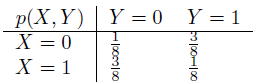 $$\mathbb{H}(X, Y) = -\left[ \frac{1}{8} \log_{2} \frac{1}{8} + \frac{3}{8} \log_{2} \frac{3}{8} + \frac{3}{8} \log_{2} \frac{3}{8} + \frac{1}{8} \log_{2} \frac{1}{8} \right] = 1.81 \text{ bits}$$