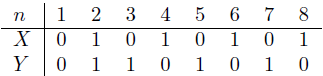 예를 들어, 1 ~ 8까지의 정수 $n \in \{ 1, \dots, 8 \}$ 중 하나를 고른다고 가정하겠습니다. $X(n) = 1$은 $n$이 짝수일 때 그리고 $Y(n) = 1$은 $n$이 소수일 때라고 정의하겠습니다. 그러면 다음과 같이 표를 만들 수 있습니다.
