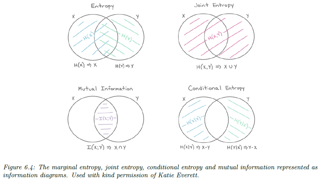 $$\mathbb{I}(X; Y) = \mathbb{H}(X) - \mathbb{H}(X \mid Y) = \mathbb{H}(Y) - \mathbb{H}(Y \mid X)$$