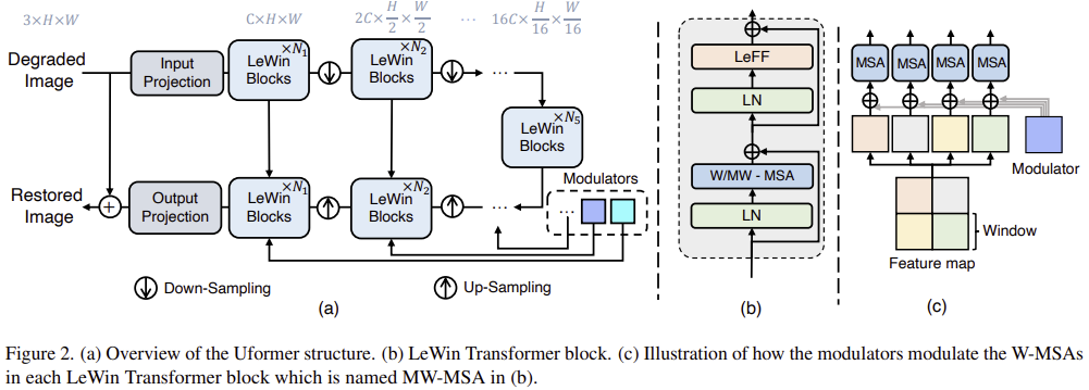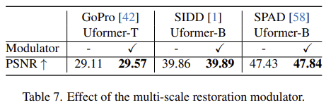 서로 다른 열화는 교란 패턴이 제각각이기 때문에 UFormer가 다양한 복원 과제에서 디테일을 더 잘 살리는 가벼운 Multi-Scale Restoration Modulator를 추가로 제안합니다. 이 모듈을 특징을 보정 (calibration)하여 더 많은 디테일 복원을 유도하는 것이 목적입니다.