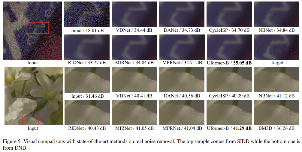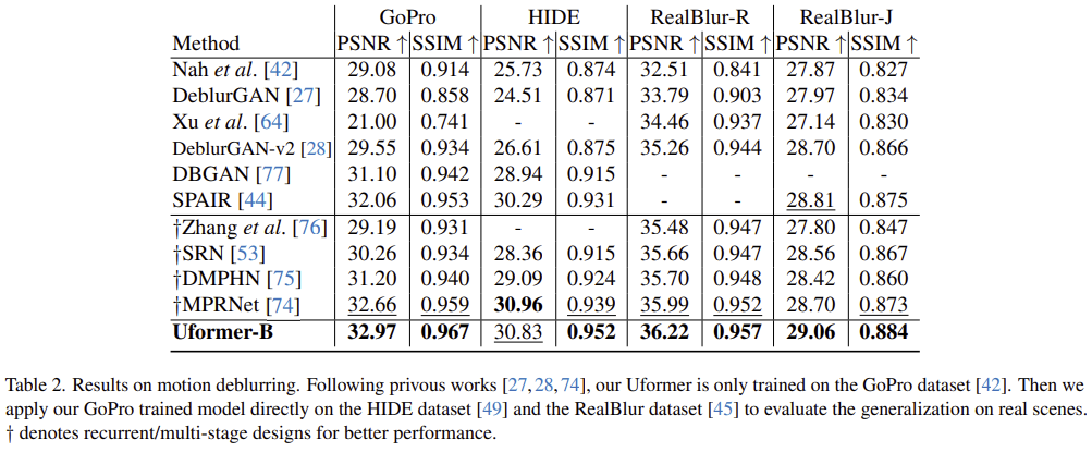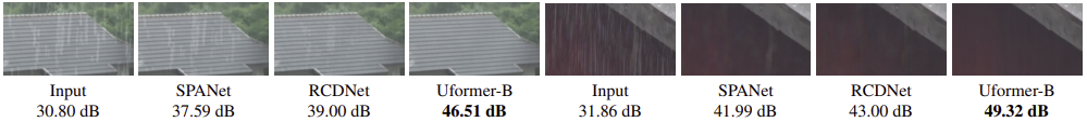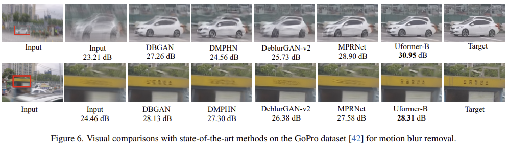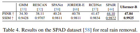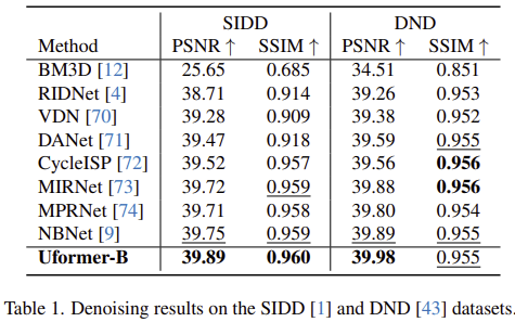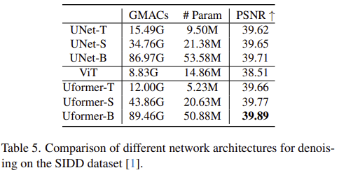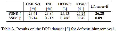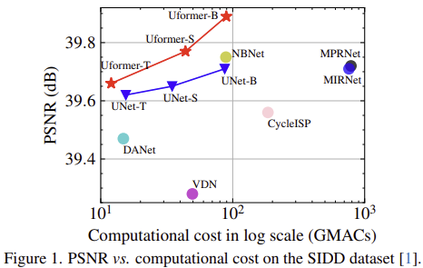 그림 1은 기존 모델들과 UFormer 사이의 efficiency graph를 보여주고 있습니다. 결과에서 볼 수 있는 것과 같이 UFormer는 기존의 이미지 복원 모델들보다 훨씬 적은 연산량에 높은 PSNR를 보여주고 있습니다.