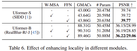 UFormer의 핵심적인 구조로 Locally-enhanced Window (LeWin) Transformer Block에서는 전역 self-attention 대신 non-overlapping window 기반 self-attention을 사용해 고해상도에서 계산량을 크게 줄이고 계층 구조에서 해상도가 낮아질수록 상대적으로 더 넓은 문맥도 포착할 수 있게 만들고자 하였습니다. 또한, 이미지 복원에는 지역 문맥도 중요하다는 점을 반영해 Transformer Block의 FFN에 Depth-wise convolution을 추가하여 로컬 정보를 더 잘 담도록 하였습니다. 또한 Learnable Restoration Modulator에서는 다양한 열화등에 유연하게 대응하기 위해 디코더 여러 계층에서 특징을 조정하는 멀티 스케일 spatial bias 형태를 가벼운 모듈을 추가합니다. 구현 방식은 매우 단순하게 윈도우 크기의 learnable tensor를 각 블록 특징에 더하는 방식으로 파라미터 및 연산 증가를 최소화하면서 디테일 복원을 돕는다고 설명합니다.
