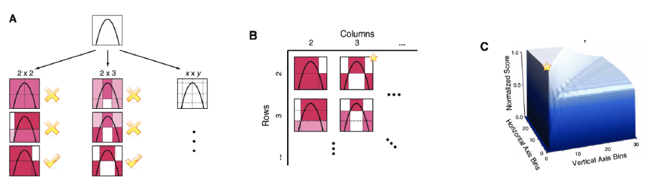 기본적으로 통계량 MIC의 직관은 "$X$와 $Y$ 사이에 어떤 관계가 존재한다면 2차원 입력공간을 적절히 격자로 나누었을 때 그 관계를 포착하는 어떤 이산화 방식이 존재할 것이다"입니다. 하지만, 저희는 무엇이 "정답 격자"인지 모르기 때문에 MIC는 서로 다른 격자 해상도를 바꾸고 격자 경계 위치도 적절하게 바꾸어가며 MI가 가장 크게 나오는 것을 찾아야합니다.