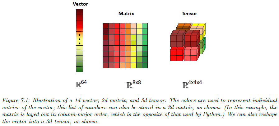 텐서는 그림 7.1과 같이 2차원 배열인 행렬을 3차원 이상으로 일반화한 것을 의미합니다. 예를 들어 3차원 텐서의 원소는 $A_{ijk}$로 표기합니다. 텐서의 차원의 개수는 텐서의 차수(order) 또는 랭크(rank)라고 부릅니다. 이때, 고급선형대수에서는 행렬을 선형사상(linear transform)으로 해석하면서 텐서를 다중선형사상(multi-linear transform)으로도 해석하게 되는데 이러한 내용까지는 필요하지는 않습니다.