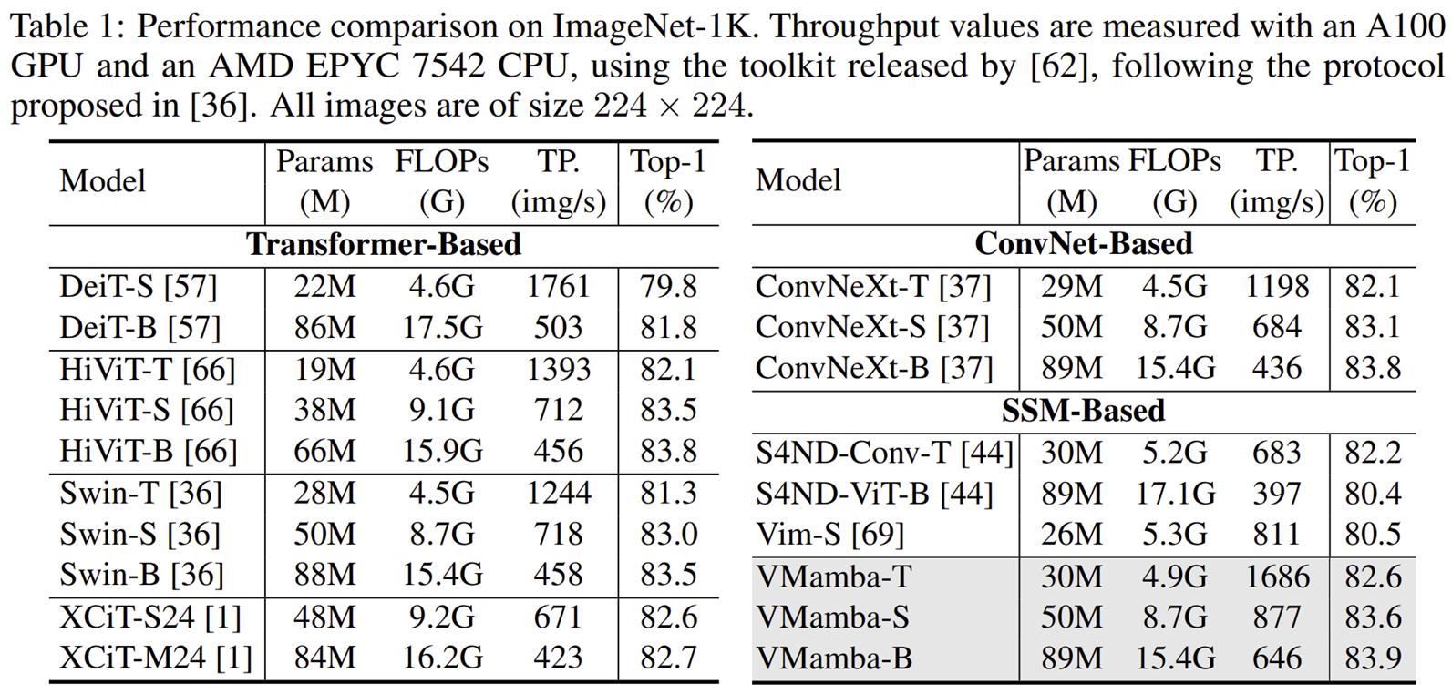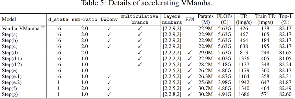 VMamba는 처음 설계된 vanilla VSS 블록만 썼을 때, Tiny 기준으로 22.9M 파라미터, 5.6G FLOPs에서 ImageNet‑1K Top‑1 82.2%를 달성하지만, 처리 속도가 426 img/s 수준에 그쳐 실서비스나 대형 다운스트림 태스크를 생각하면 다소 무거운 편이다. 이러한 문제를 해결하기 위해 본 논문에서는 몇 가지 가속화 기법을 제시한다.