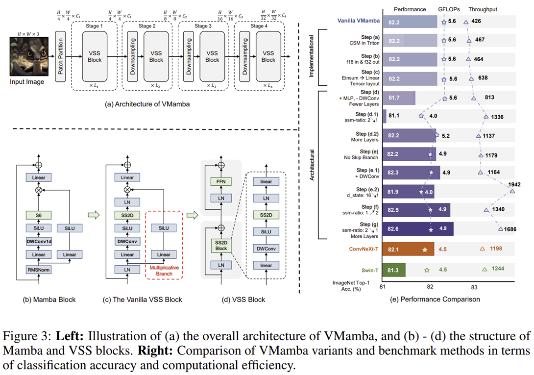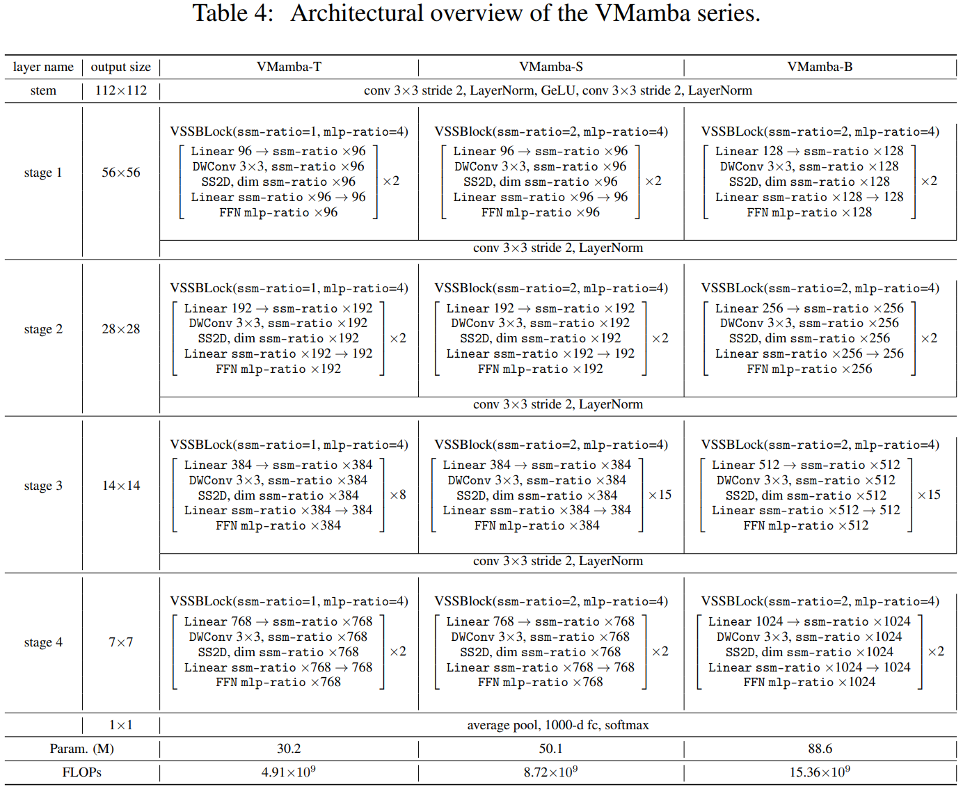 각 Stage는 (1) 해상도를 절반으로 줄이는 다운샘플링 레이어와 (2) 여러 개의 Visual State Space (VSS) Block으로 구성된다. Swin Transformer, ConvNeXt와 달리 별도의 positional embedding 없이도 SS2D와 depth-wise convolution이 공간적 inductive bias와 전역 문맥 정보를 함께 제공하도록 설계된 것이 특징이다. VMamba-Tiny/Small/Base는 동일한 stage 구조를 공유하되 채널 수 $C_{i}$와 block 개수만 조정하여 파라미터 수와 FLOPs를 모델 규모에 맞추어 스케일링한다.