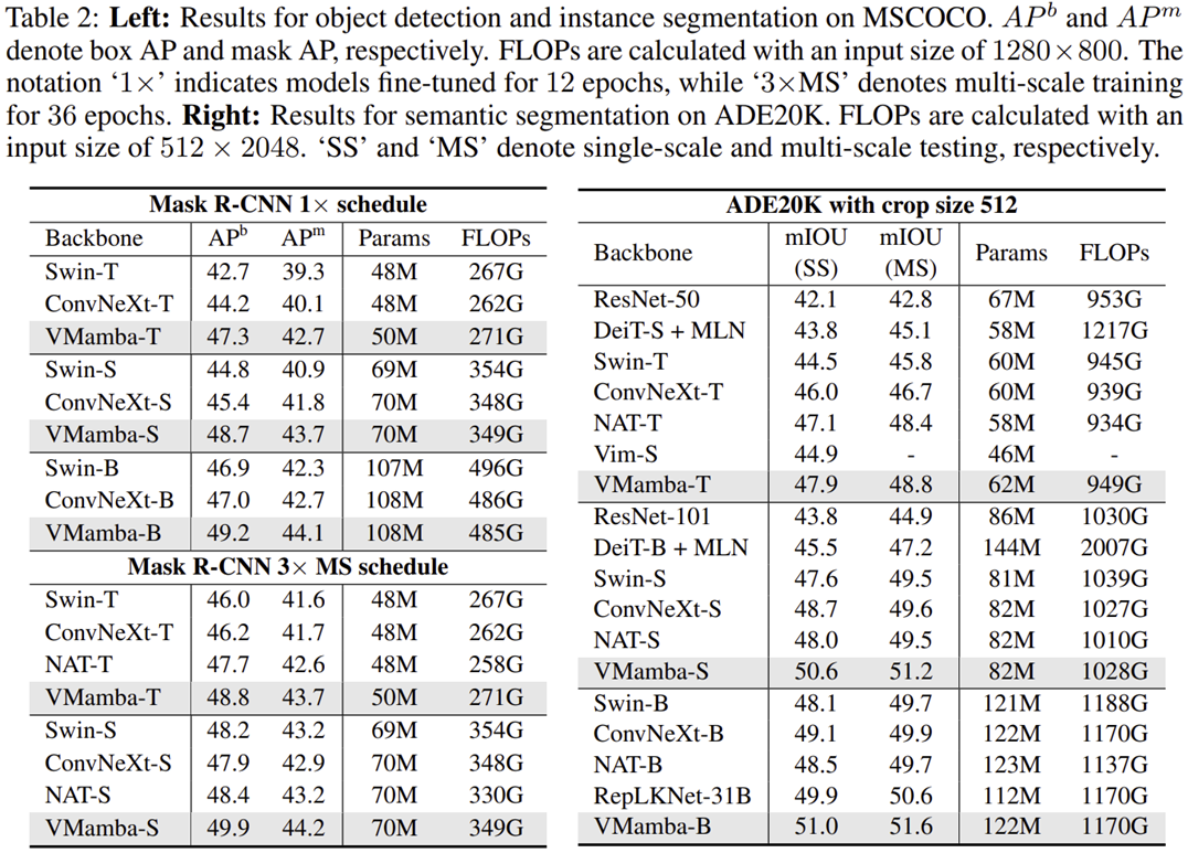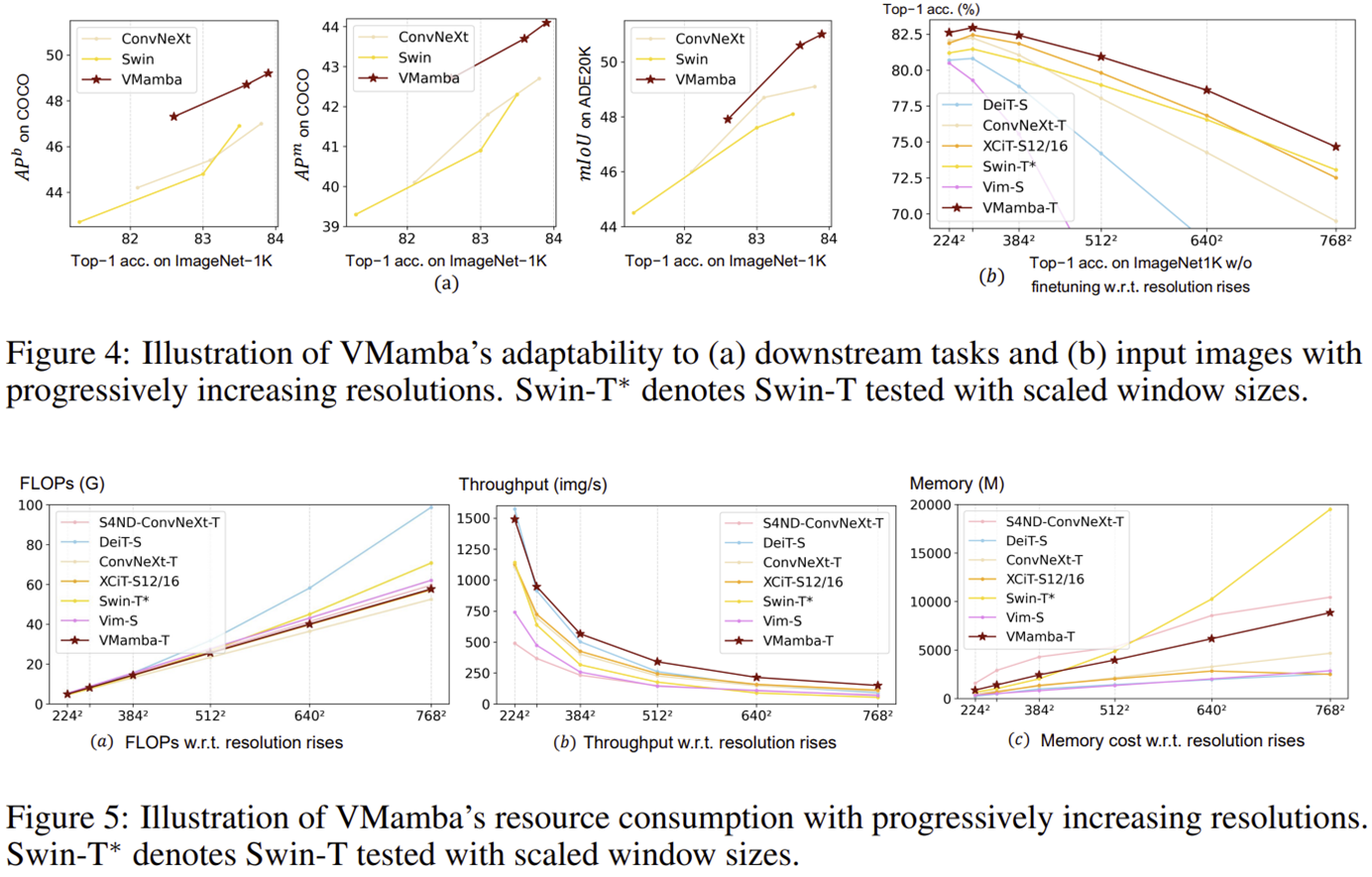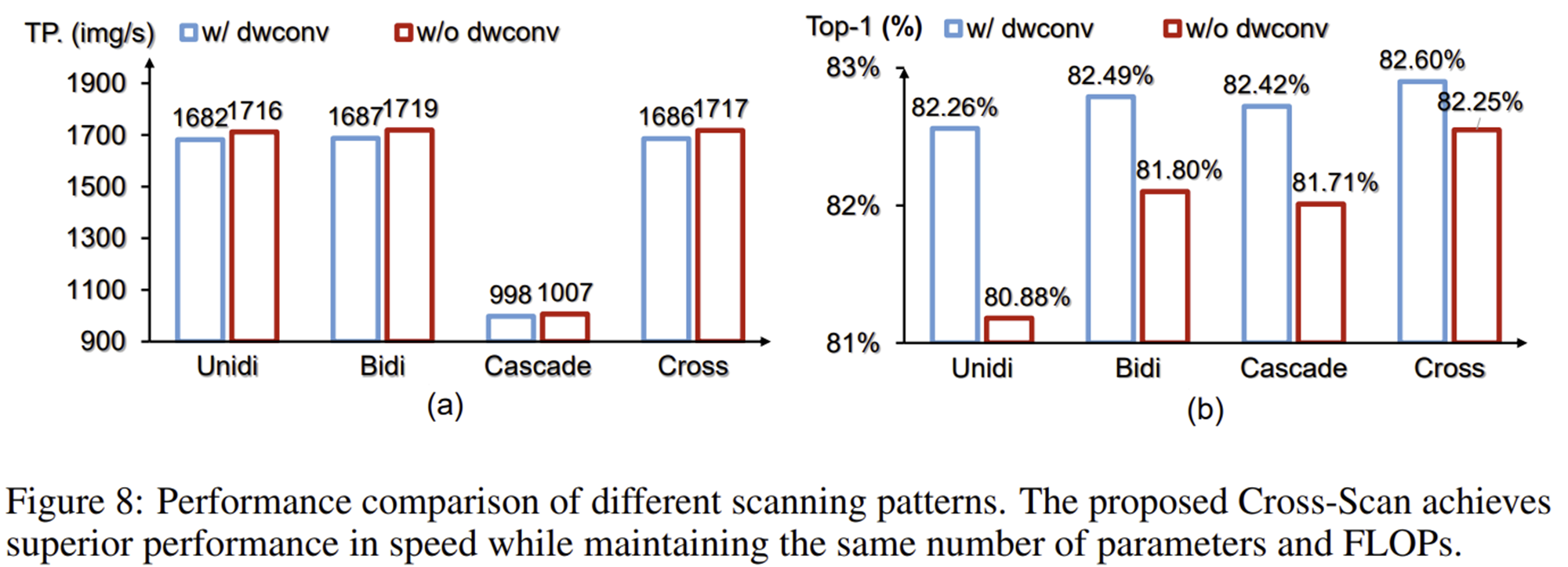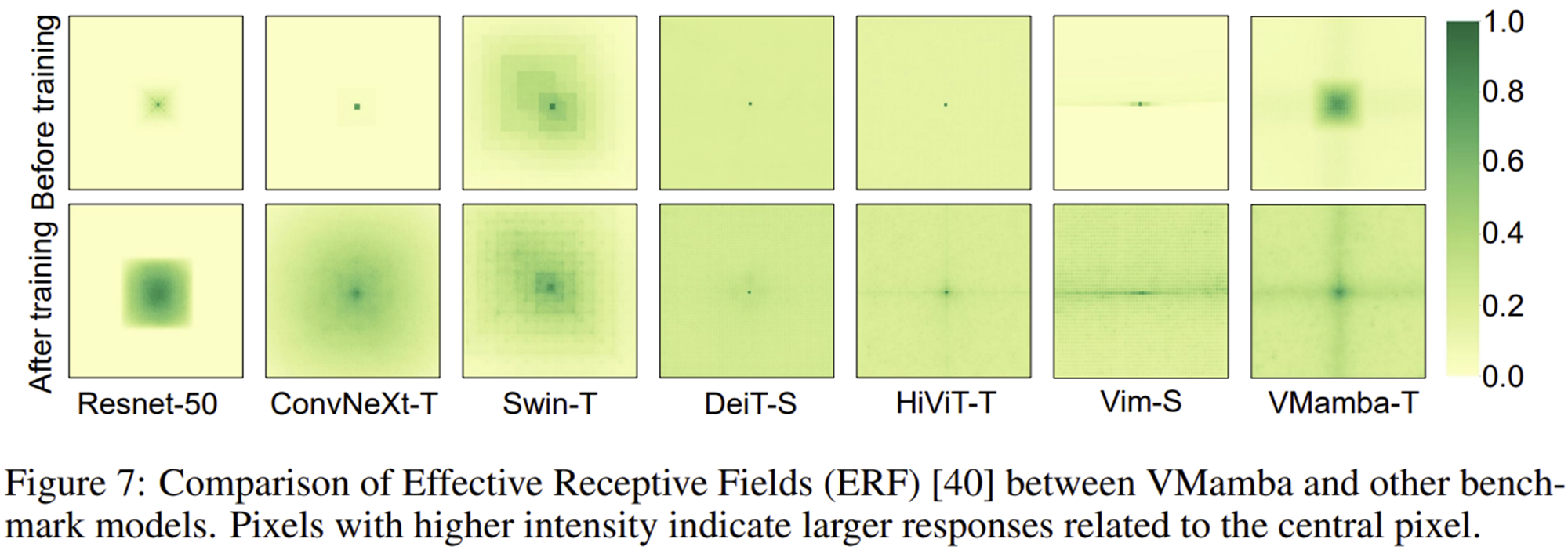 한편 비전 분야에서도 S4ND, Vim 등 SSM을 이미지 및 비디오에 도입하려는 시도가 있었지만 대부분은 CNN과 Transformer와 혼합된 하이브리드 구조에 머물렀으며 "순수 SSM 기반 비전 백본"은 거의 탐색되지 않았다. 특히, 1D 커널을 단순히 2D로 확장하는 식의 접근은 입력 의존적인 가중치를 활용하기 어렵기 때문에 문맥 표현력이 제한된다. 본 논문에서 제안하는 VMamba는 이러한 연구 공백을 메우기 위해 제안된 SSM 기반 비전 백본으로 self-attention 대비 훨씬 가벼운 선형 복잡도를 유지하면서 2D Selective Scan (SS2D)을 통해 1D 시퀀스 스캔과 2D 공간 트래버설의 간극을 메우고 전역 문맥 정보를 효과적으로 수집하도록 설계되었다.