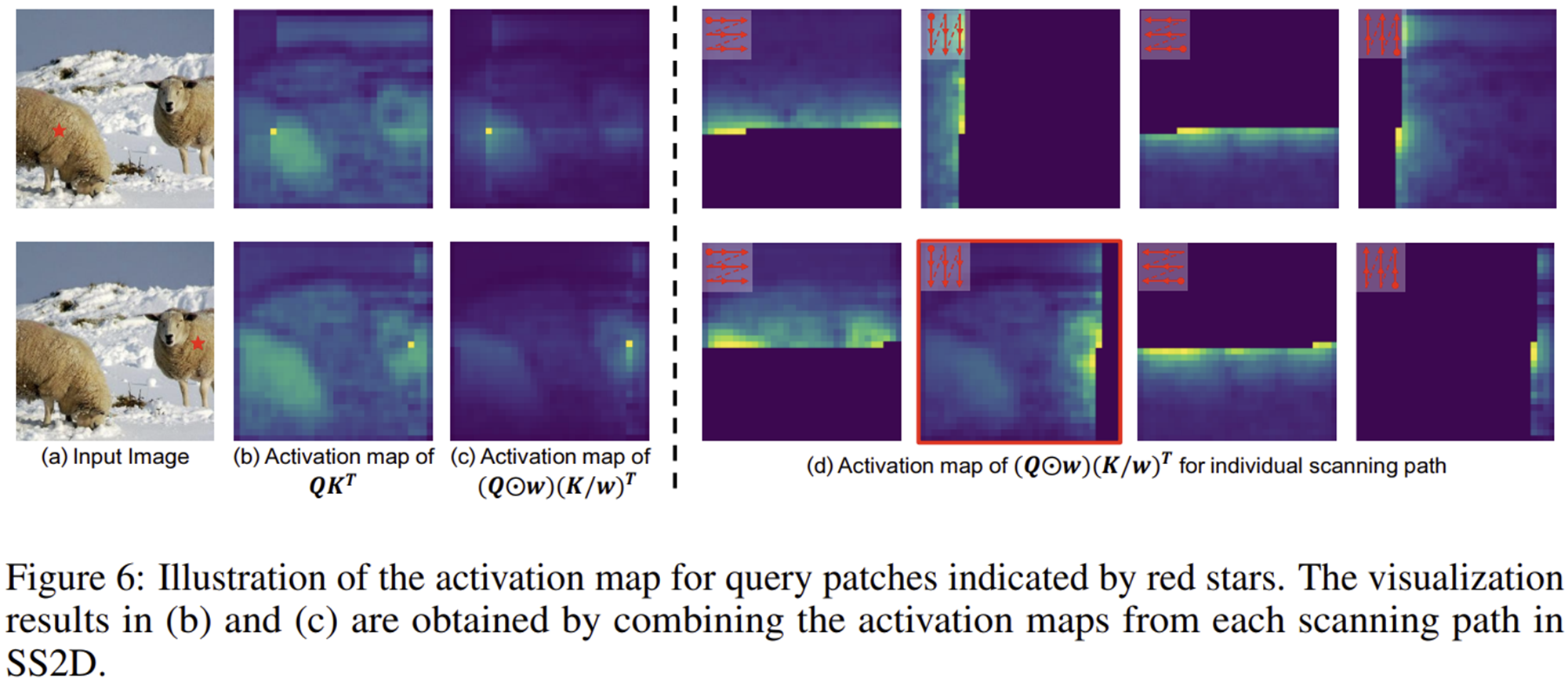 이 과정을 거치면, 한 픽셀은 네 개의 스캔 경로를 통해 이미지 전체의 정보를 압축된 hidden state 형태로 전달받을 수 있다. 결과적으로 SS2D는 self-attention처럼 전역 receptive field와 동적 가중치를 가지지만, 스캔 경로를 따라 누적되는 선택적 상태 업데이트 덕분에 계산·메모리 복잡도가 토큰 수에 선형적으로 증가한다.