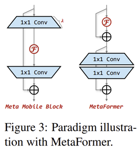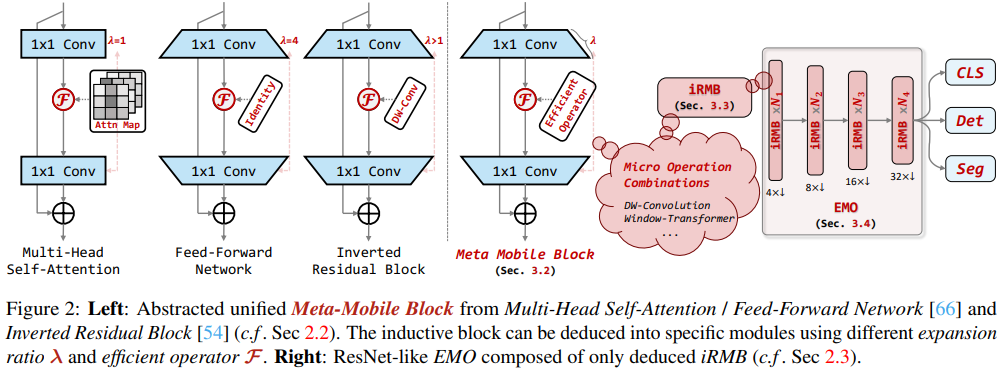 여기서 핵심은 그림 2와 같이 MMB가 확장비 $\lambda$와 효율 연산자 $\mathcal{F}$라는 두 개의 인자로 IRB, MHSA, FFN을 한 틀에 인스턴스화 할 수 있는 메타-패러다임이라는 것이다.