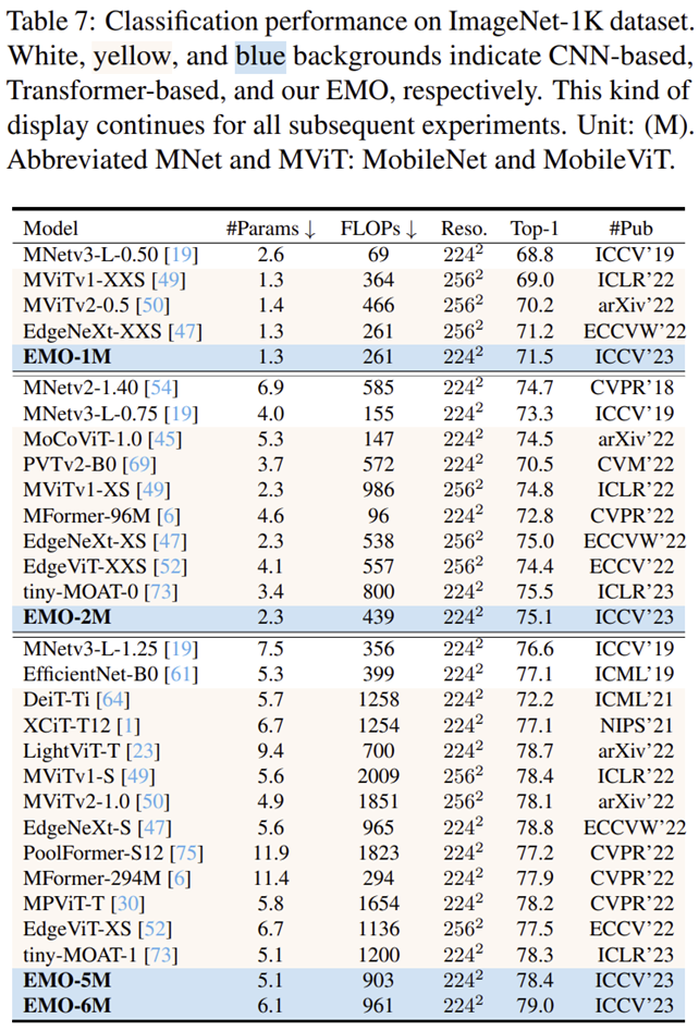 그리고 이 4가지 기준으로 Table 1과 같이 기존 계열을 간단하게 진단한다. MobileNet 계열은 전반적으로 성능이 약간 낮고 파라미터가 약간 높은 편으로 평가하고 MobileViT 계열은 성능은 좋지만 FLOPs가 크고 모듈이 다소 복잡하다는 점을 지적한다. EdgeNeXt와 EdgeViT는 결과는 좋지만 기본 블록 자체가 복잡한 모듈 조합으로 이루어져 있다는 문제 의식을 제시한다. 하지만 본 논문에서 제안하는 EMO는 이 4가지 기준을 전부 만족하는 모습을 볼 수 있다.