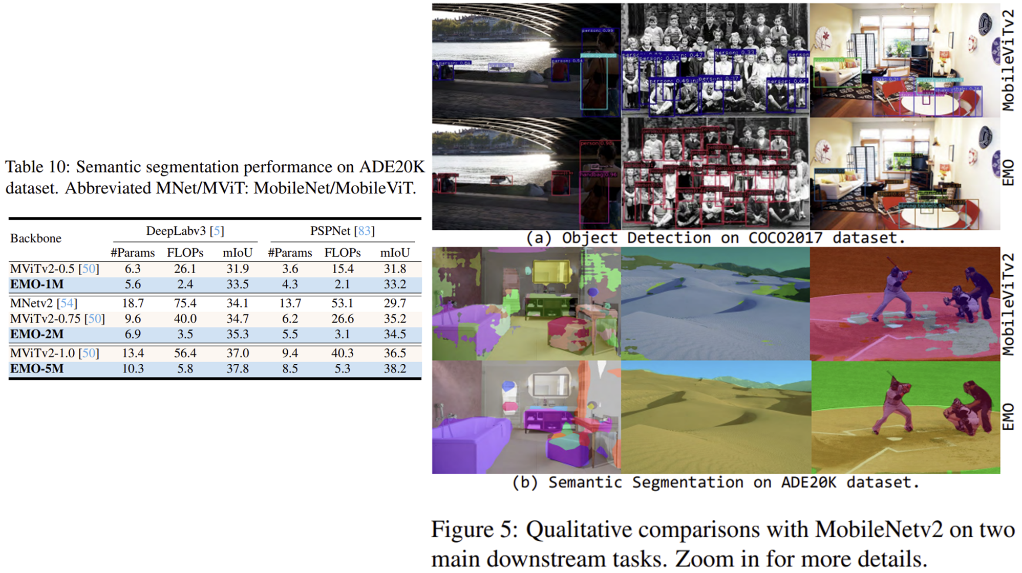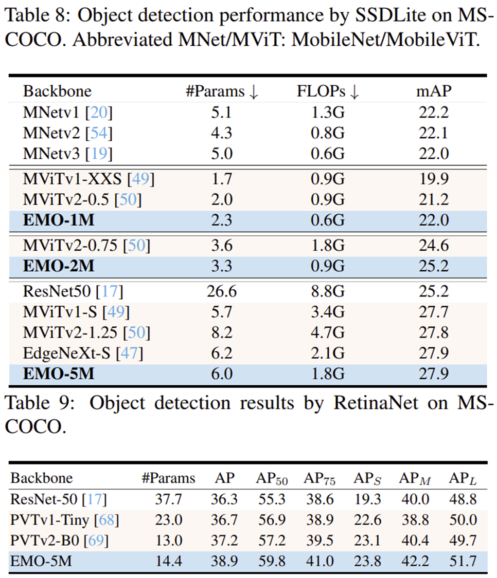 - 구조 관점에서, MetaFormer를 확장한 dense prediction 모델은 down-sampling을 위해 추가적인 patch embedding layer를 사용하는 반면, EMO는 오직 iRMB로만 구성된다.