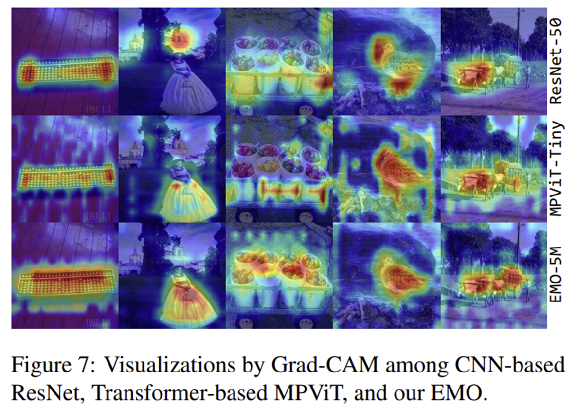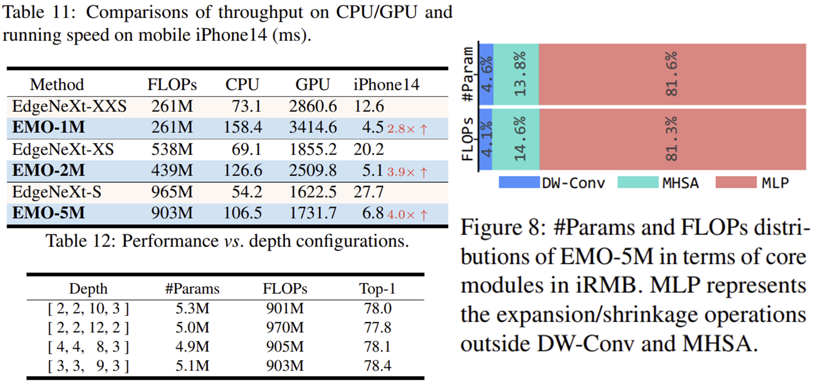 - 결과 관점에서, 인스턴스화된 EMO-5M(5.1M #Params, 903M FLOPs)은, 인스턴스화한 PoolFormer-S12(11.9M #Params, 1,823M FLOPs)보다 +1.2↑ 더 높은 성능을 보인다. 이는 더 강력한 efficient operator가 이점을 만든다는 점을 보여준다.