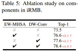 - 두 번째/세 번째 행의 결과는 각 구성요소가 성능에 기여함을 보여준다. 예를 들어, DW-Conv를 추가하면 +3.1↑, EW-MHSA를 추가하면 +4.1↑의 향상이 나타난다.