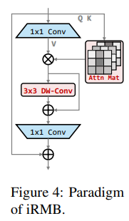 iRMB는 앞서 유도한 Meta Mobile Block(MMB)을 “현실적으로 배포 가능한” 수준으로 구체화한 마이크로 블록이다. 핵심설계는 효율 연산자 $\mathcal{F}$를 어텐션 $\rightarrow$ 컨볼루션 캐스케이드 구조로 두어 전역 상호작용(Transformer의 동적 모델링)과 국소 특징(Conv의 효율성)을 동시에 가져오려는 것이다. 즉, $\mathcal{F}(\cdot) = \text{Conv}(\text{MHSA}(\cdot))$의 형태로 “긴 거리 상호작용 + 로컬 패턴”을 한 블록 안에서 처리하는 방향을 택한다.